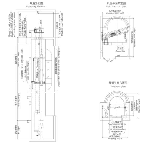 | Load(kg) | Speed (m/s) | Internal car size (mm) | Door size (mm) | Hoistway(mm) | Machine room size(mm) | Door opening type | ||||||||